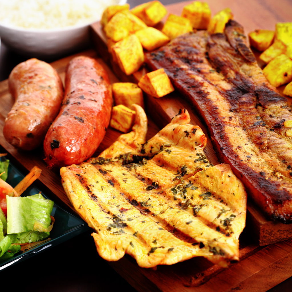 Carne de res, pollo, cerdo, morcilla, colombinas de pollo chorizo, papas y yuca.